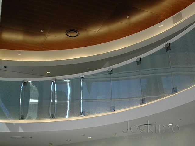 Our Jockimo HologramGlass™ Crystal design glass is utilized in the hand rail glass in this University project in CA.