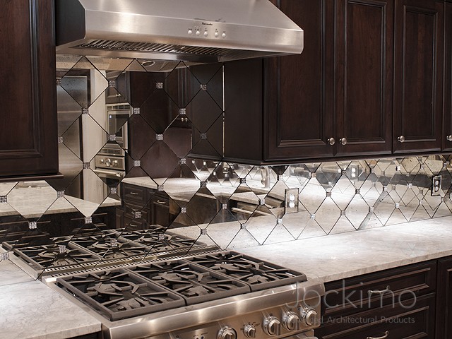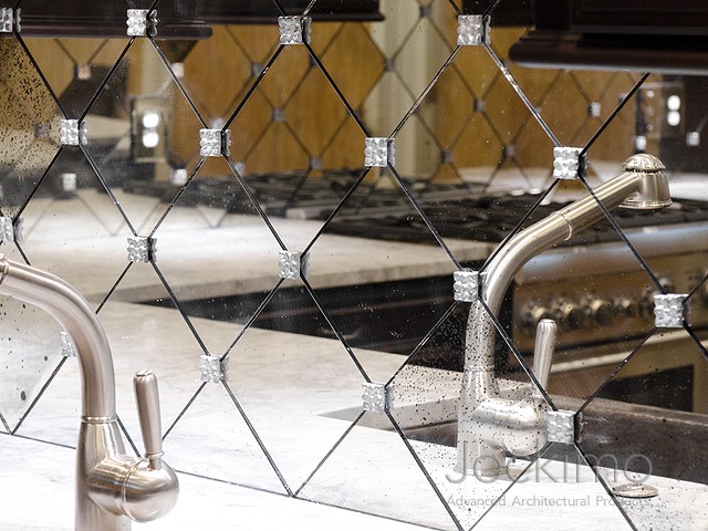 Kitchen and Bathroom Glass: Jockimo Distressed Antique pinhole glass butted tiles with hand cast lead quatrefoil rosettes.