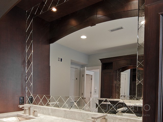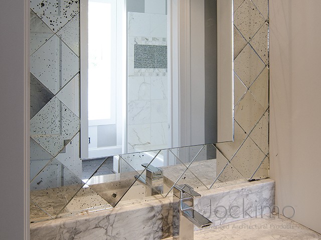 Powder Room Wall Glass: Jockimo Distressed Antique pinhole glass with hand cast lead rosettes and beveled antique pinhole border accents.