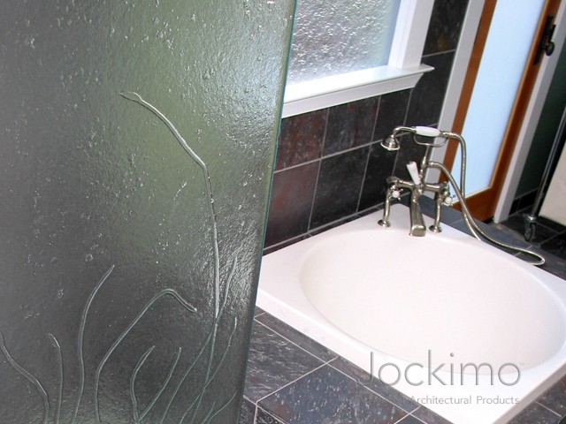 Our Sea Grass texture was cast into this shower panel. The free-form design goes perfectly with the real stone floor in the shower. The glass is 3/8" Clear tempered. There was also a bathroom window produced on this project to match the texture in the shower panel.