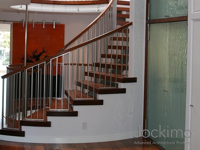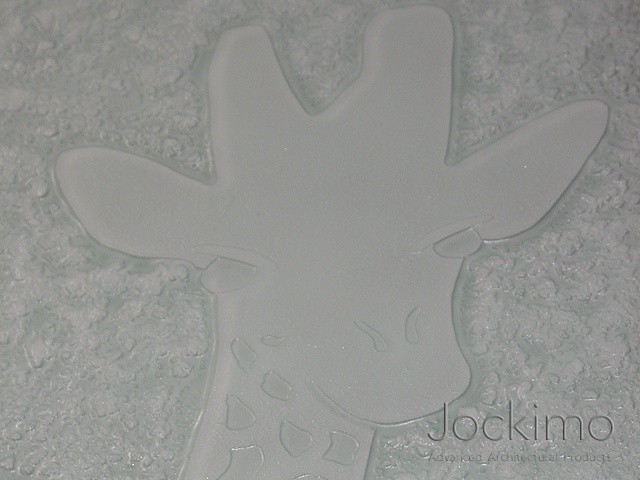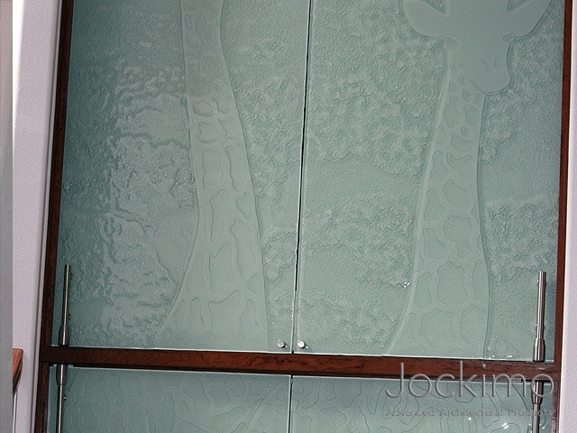 Our customer requested giraffes to be cast into 4 large panels of glass for their new home. We cast the Jockimo created design into the panels and then back painted the panels a white metallic color. Holes were drilled on the top of the panel to accommodate the barn door style hardware.