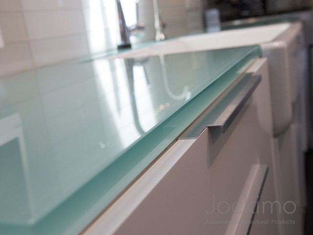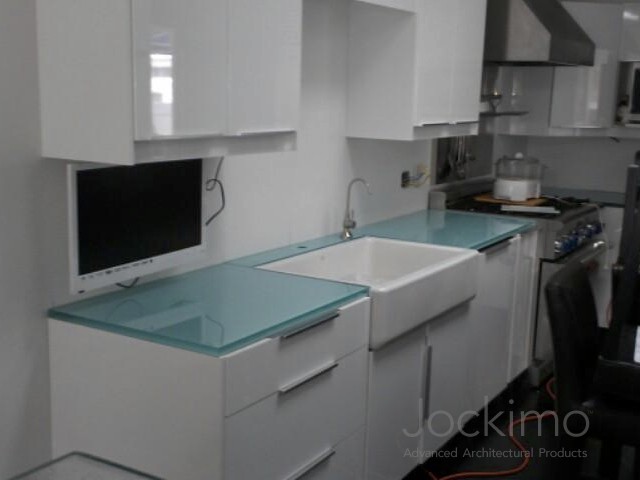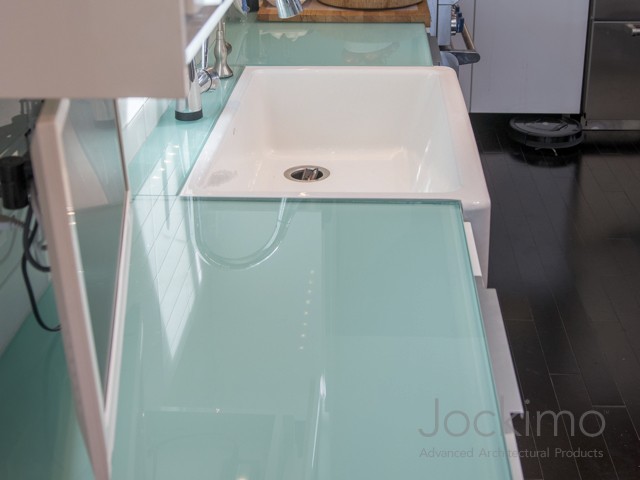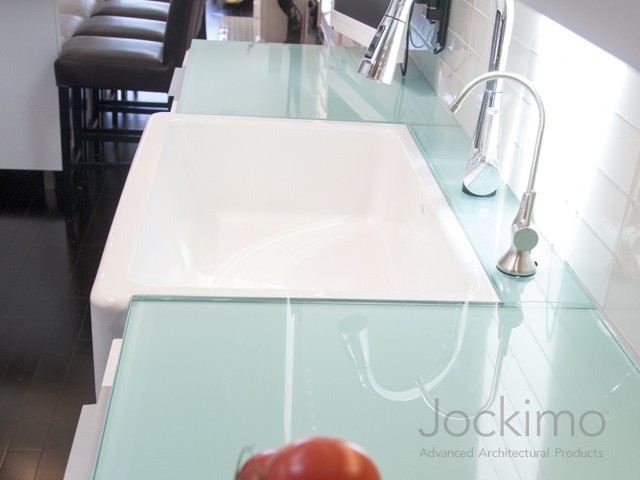 Private Residence - Southern, CAJockimo produced 1" ThickGlass™ in low iron for the dining room table. The texture is Jockimo's Small Rocks. The kitchen counter tops are 3/4" back painted glass.